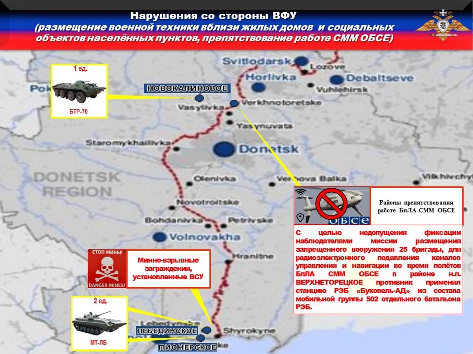 🚫Украинская сторона продолжает блокировать работу БпЛА ОБСЕ. Так, с целью недопущения фиксации наблюдателями миссии размещенного в нарушение Минских соглашений запрещенного вооружения 25 бригады, для радиоэлектронного подавления каналов управления и навигации во время полётов БпЛА СММ ОБСЕ в районе н.п. ВЕРХНЕТОРЕЦКОЕ противник применял станцию РЭБ «Буковель-АД» из состава мобильной группы 502 отдельного батальона РЭБ.