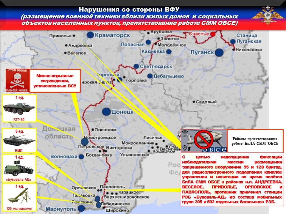 ♦️Украинская сторона продолжает блокировать работу БпЛА ОБСЕ. Так, с целью недопущения фиксации наблюдателями миссии размещения запрещенного вооружения 95 и 128 бригад, для радиоэлектронного подавления каналов управления и навигации во время полётов БпЛА СММ ОБСЕ в районах н.п. АНДРЕЕВКА, ВЕСЕЛОЕ, ПРИВОЛЬЕ, ОРЛОВСКОЕ и ПАВЛОПОЛЬ, противник применил станции РЭБ «Буковель-АД» из состава мобильных групп
