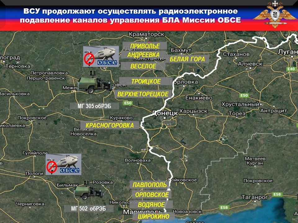 ⚠️Украинская сторона продолжает блокировать работу БпЛА ОБСЕ. Так, с целью недопущения фиксации наблюдателями миссии размещения запрещенного вооружения 25 и 95 бригад, для радиоэлектронного подавления каналов управления и навигации во время полётов БпЛА СММ ОБСЕ в районах н.п. АНДРЕЕВКА, РУСИН ЯР, ПРИВОЛЬЕ и ВЕРХНЕТОРЕЦКОЕ противник применил станции РЭБ «Буковель-АД» из состава мобильной группы 305 отдельного батальона РЭБ.
