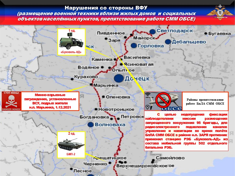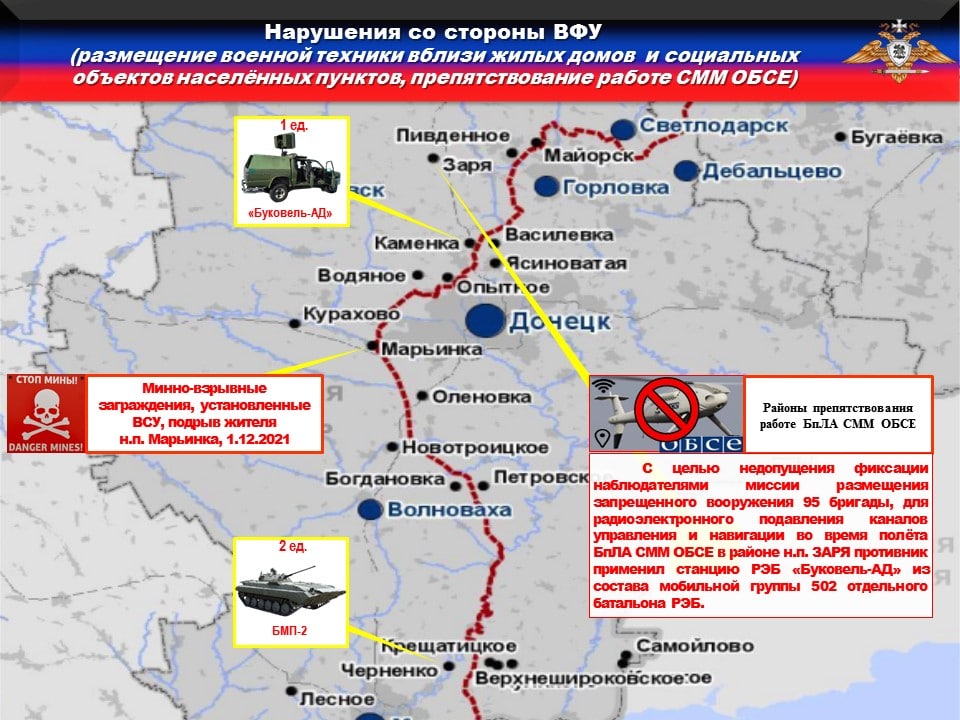 ‼️Украинская сторона продолжает блокировать работу БпЛА ОБСЕ. Так, с целью недопущения фиксации наблюдателями Миссии размещения запрещенного вооружения 95 и 128 бригад, для радиоэлектронного подавления каналов управления и навигации во время полёта БпЛА СММ ОБСЕ в районах н.п. ТАРАСОВКА, ПИЩЕВИК и ТАЛАКОВКА противник применял станции РЭБ «Буковель-АД» из составов мобильных групп 305 и 502 отдельных батальонов РЭБ.