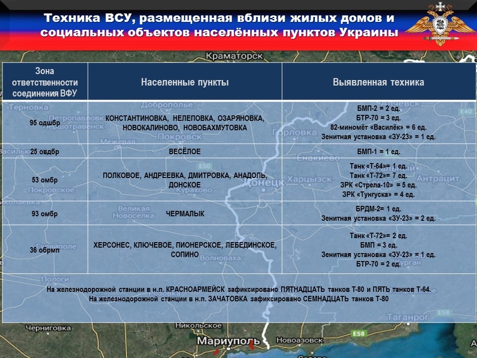 🚫В нарушение ТРЕТЬЕГО пункта дополнительных мер, вооруженные формирования Украины разместили ШЕСТЬ единиц военной техники в подконтрольных населенных пунктах: ДВЕ буксируемые гаубицы Д-30А и ПТРК «Конкурс» на территории объекта вблизи жилого района н.п. ШЕВЧЕНКО из состава 53 омбр, командно-штабную машину Р-142, БМП-1 и зенитную установку ЗУ-23 вблизи н.п. ПИОНЕРСКОЕ из состава 36 обрмп.