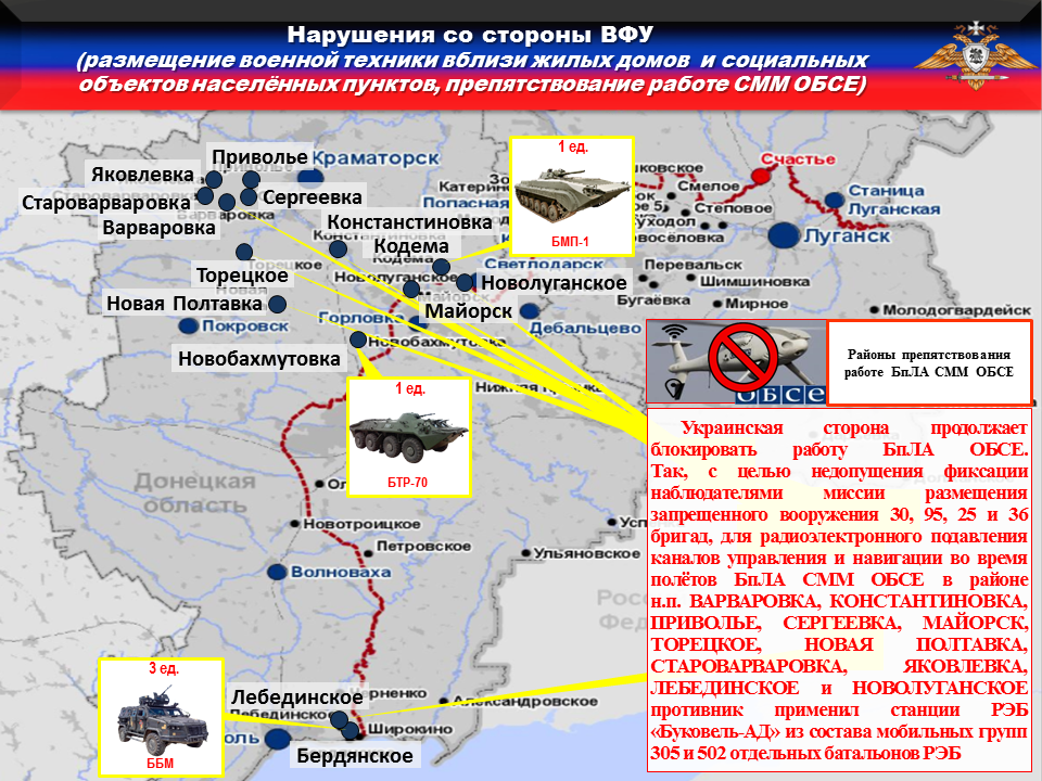 🔹Украинская сторона продолжает блокировать работу БпЛА ОБСЕ. Так, с целью недопущения фиксации наблюдателями Миссии размещения запрещенного вооружения 30, 95, 25 и 36 бригад, для радиоэлектронного подавления каналов управления и навигации во время полётов БпЛА СММ ОБСЕ в районе н.п. ВАРВАРОВКА, КОНСТАНТИНОВКА, ПРИВОЛЬЕ, СЕРГЕЕВКА, МАЙОРСК, ТОРЕЦКОЕ, НОВАЯ ПОЛТАВКА, СТАРОВАРВАРОВКА, ЯКОВЛЕВКА, ЛЕБЕДИНСКОЕ и НОВОЛУГАНСКОЕ противник применил станции РЭБ «Буковель-АД» из состава мобильных групп 305 и 502 отдельных батальонов РЭБ.