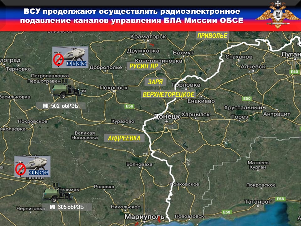 ♦️За неделю зафиксировано ПЯТЬ фактов подавления каналов управления и навигации БпЛА наблюдателей СММ ОБСЕ вдоль линии боевого соприкосновения в районах населенных пунктов АНДРЕЕВКА, РУСИН ЯР, ПРИВОЛЬЕ, ВЕРХНЕТОРЕЦКОЕ и ЗАРЯ.
