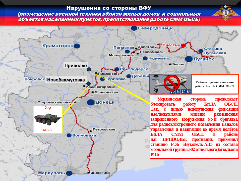 ⚠️Украинская сторона продолжает блокировать работу БпЛА СММ ОБСЕ. Так, с целью недопущения фиксации наблюдателями миссии размещения запрещенного вооружения 95-й и 36-й бригад, для радиоэлектронного подавления каналов управления и навигации во время полётов БпЛА СММ ОБСЕ в районах н.п. ЛЕНИНСКОЕ и ПИЩЕВИК противник применил станции РЭБ «Буковель-АД» из состава мобильных групп 502 и 305 отдельных батальонов РЭБ.
