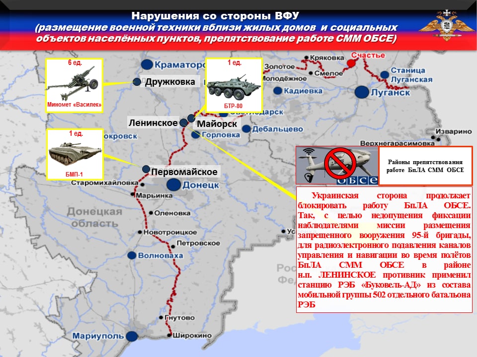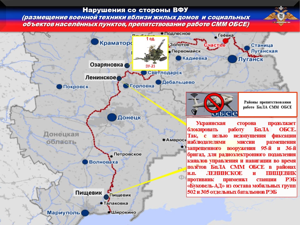 ⚠️Украинская сторона продолжает блокировать работу БпЛА СММ ОБСЕ. Так, с целью недопущения фиксации наблюдателями миссии размещения запрещенного вооружения 95-й и 36-й бригад, для радиоэлектронного подавления каналов управления и навигации во время полётов БпЛА СММ ОБСЕ в районах н.п. ЛЕНИНСКОЕ и ПИЩЕВИК противник применил станции РЭБ «Буковель-АД» из состава мобильных групп 502 и 305 отдельных батальонов РЭБ.