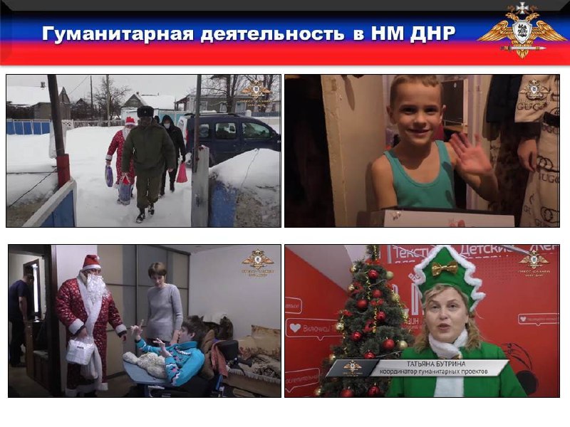🔹В течении недели в Республике для детей военнослужащих были организованны праздничные утренники в ознаменовании наступления нового, 2022 года. Силами Народной Милиции Донецкой Народной Республики, центром медиапроектов «Звезда», благотворительных фондов Руспомощь, Дорога Добра и География Сердца организованны праздники для детей. В ходе праздничной программы для детей выступали любимые герои мультфильмов и сказок, и, конечно же, Дед Мороз. Ребята активно участвовали, водили хороводы, танцевали, пели и улыбались. Помимо сладких подарков, им так же были переданы мягкие игрушки, обувь и одежда.