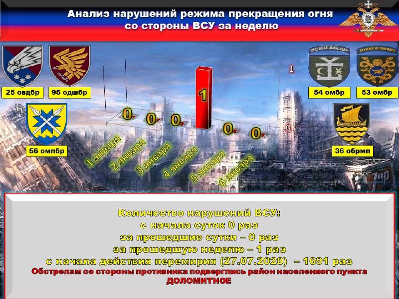 🔻За прошедшую неделю зафиксировано ОДНО нарушение режима прекращения огня со стороны украинских вооруженных формирований. Противник вел огонь по населённым пунктам Республики, применяя стрелковое оружие.