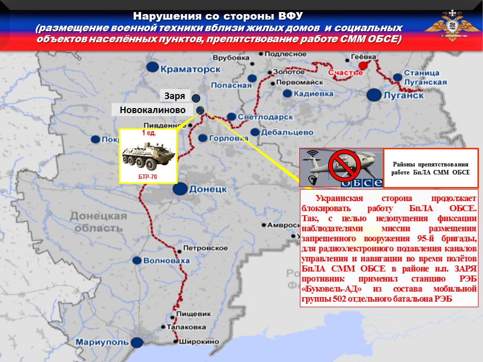 ⚠️Украинская сторона продолжает блокировать работу БпЛА ОБСЕ. Так, с целью недопущения фиксации наблюдателями миссии размещения запрещенного вооружения 95-й бригады, для радиоэлектронного подавления каналов управления и навигации во время полётов БпЛА СММ ОБСЕ в районе н.п. ЗАРЯ противник применил станцию РЭБ «Буковель-АД» из состава мобильной группы 502 отдельного батальона РЭБ.