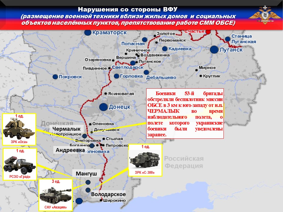 ❗️Кроме того, боевики 53-й бригады обстреляли беспилотник миссии ОБСЕ в 3 км к юго-западу от н.п. ЧЕРМАЛЫК во время наблюдательного полета. Важно отметить, что данный обстрел был заранее спланирован, так как о времени и месте запуска беспилотника украинские боевики были уведомлены заранее.