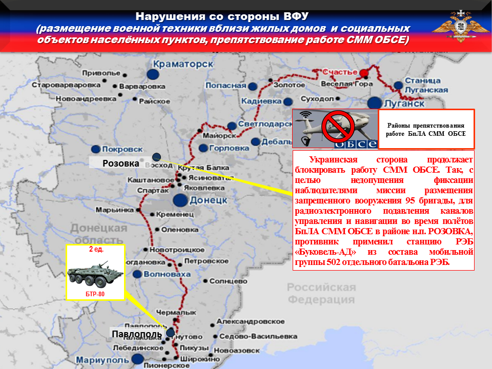 ⛔️Украинская сторона продолжает блокировать работу БпЛА СММ ОБСЕ. Так, с целью недопущения фиксации наблюдателями миссии размещения запрещенного вооружения 30, 95, 25, 53 и 36 бригад, для радиоэлектронного подавления каналов управления и навигации во время полётов БпЛА СММ ОБСЕ в районах н.п. НОВОАНДРЕЕВКА, ВОСХОД, ГНУТОВО, БОГДАНОВКА, ПРИВОЛЬЕ, ТАЛАКОВКА, ПАВЛОПОЛЬ, ВАРВАРОВКА, РАЙСКОЕ, СТАРОВАРВАРОВКА противник применил станции РЭБ «Буковель-АД» из состава мобильных групп 502 и 305 отдельных батальонов РЭБ.