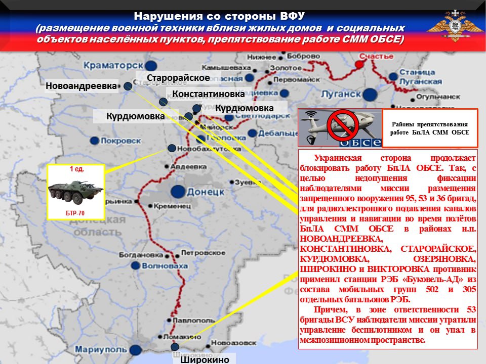 ⛔️Украинская сторона продолжает блокировать работу БпЛА ОБСЕ. Так, с целью недопущения фиксации наблюдателями миссии размещения запрещенного вооружения 95, 53 и 36 бригад, для радиоэлектронного подавления каналов управления и навигации во время полётов БпЛА СММ ОБСЕ в районах н.п. НОВОАНДРЕЕВКА, КОНСТАНТИНОВКА, СТАРОРАЙСКОЕ, КУРДЮМОВКА, ОЗЕРЯНОВКА, ШИРОКИНО и ВИКТОРОВКА противник применил станции РЭБ «Буковель-АД» из состава мобильных групп 502 и 305 отдельных батальонов РЭБ.