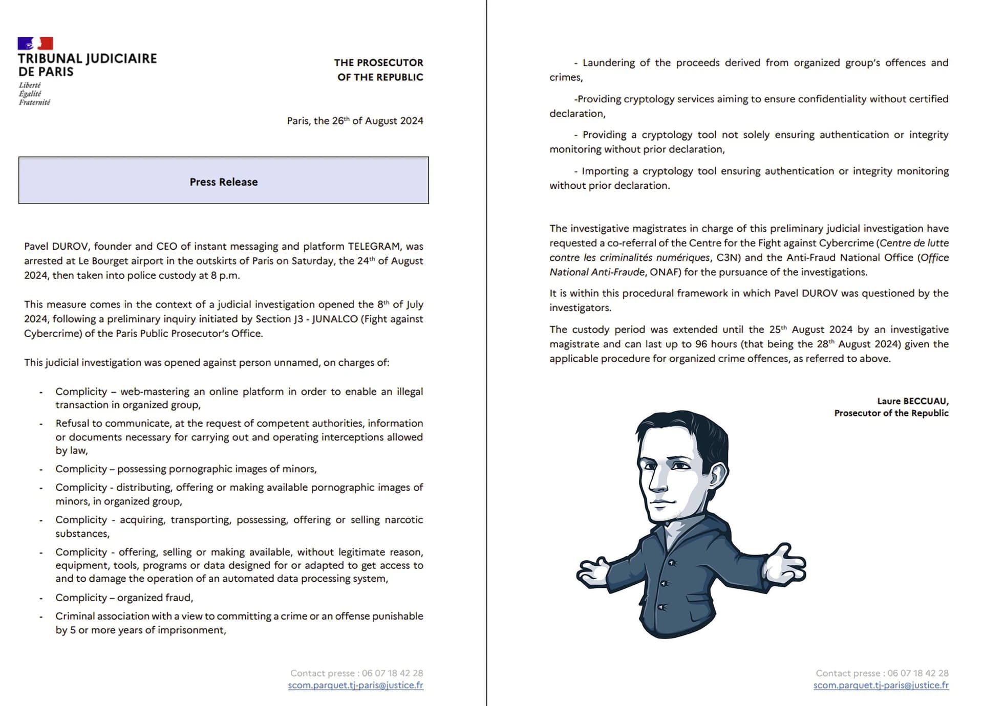 🔻 دادستانهای فرانسه اتهامات جنایی ادعایی علیه پاول دوروف بنیانگذار و مدیر عامل تلگرام را پس از دستگیری او در فرانسه را فاش کردند. این لیست مفصل شامل دوازده اتهام جدی است!