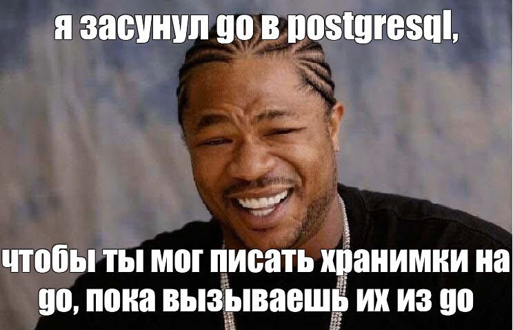 Наверняка вы знаете, что хранимки в postgresql можно писать на разных языках: sql, pl/pgsql, pl/tcl, pl/python, pl/perl, pl/java, pl/php, pl/ruby, pl/r, pl/sh, pl/psm(ansi sql), pl/scheme(древний lisp-family язык), pl/v8(js), и даже (гы) на c, но код надо заранее компилировать.