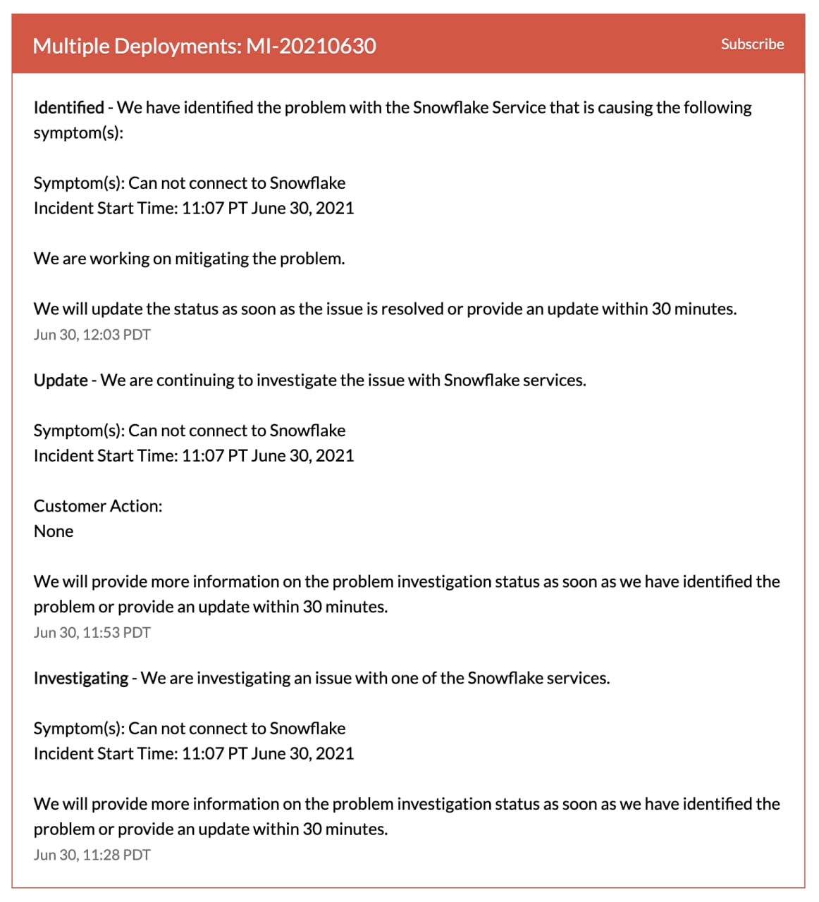 Snowflake прилег во ВСЕХ регионах и лежит уже больше часа. В чатиках (RU, EN) говорят, что кое-где работает, но status page горит алым пламенем... А я еще думаю: что у меня тесты падают?..