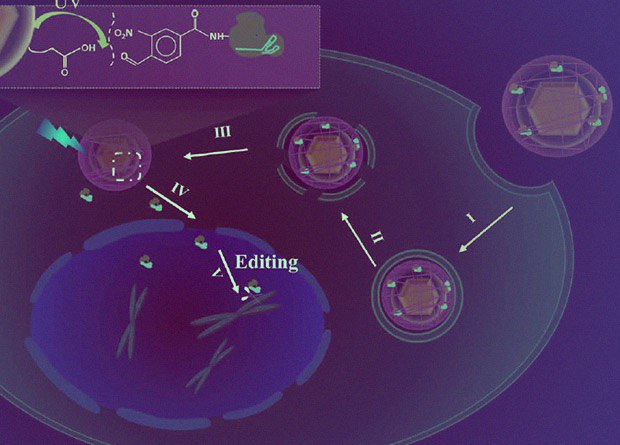Китайские ученые показали еще один способ, как можно ограничить активность системы редактирования генома CRISPR-Cas9 в пространстве и времени — для этого комплексы из Cas9 с направляющей РНК пришили к наночастицам при помощи линкера, расщепляемого ультрафиолетом. Наночастицы вводили мышам в опухоль, нагревали нужный участок, и благодаря лантаноидам в составе частиц, инфракрасное излучение превращалось в ультрафиолет, высвобождающий комплекс с Cas9. Последний отправлялся в ядро и выключал ген, необходимый для жизнедеятельности опухоли