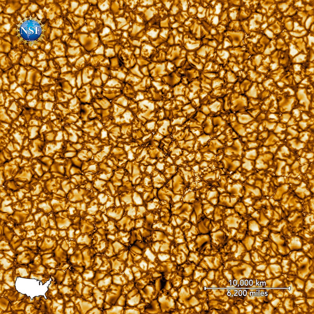 Новейший 4-метровый солнечный телескоп имени Дэниела Иноуэ, расположенный в обсерватории Халеакала (остров Мауи, Гавайи), позволил астрономам получить изображение поверхности Солнца с самым высоким на сегодняшний день разрешением. Мельчайшие детали на снимке имеют размер около 30 км!