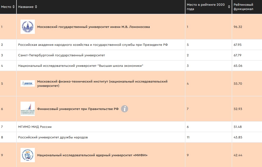 Результаты рейтинга: на первом месте — МГУ, на втором — РАНХиГС, на третьем — СПбГУ, на четвертом — ВШЭ, на пятом — МФТИ. Далее в десятке идут Финансовый университет, МГИМО, РУДН, МИФИ и УрФУ. В сравнении с рейтингом 2020 года среди лидеров больше всего прибавила РАНХиГС, бывшая ранее на пятом месте, а вот занимавший прежде 8-е место МВТУ теперь только 12-й.