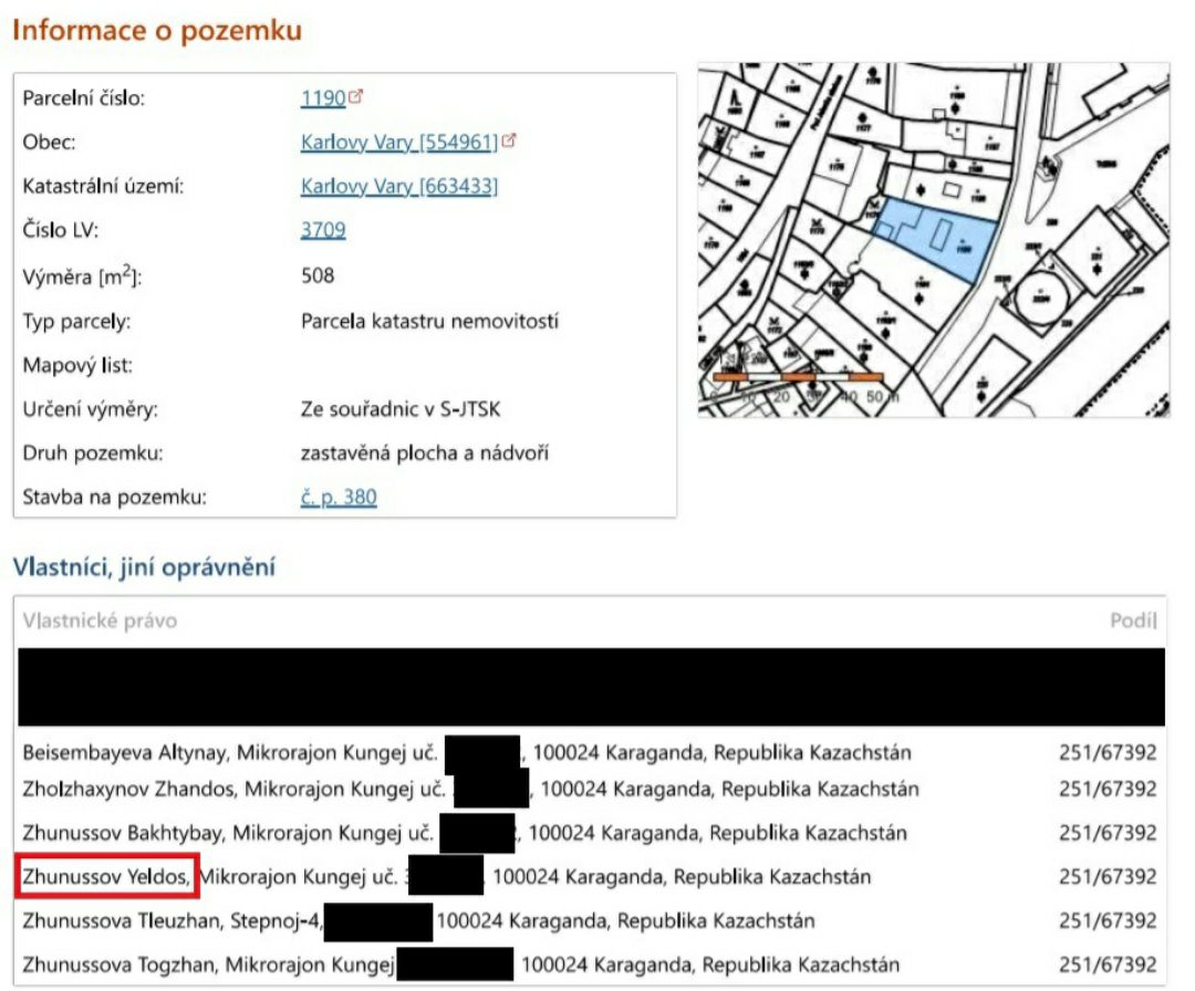 Депутат карагандинского городского маслихата и член общественного совета по противодействию коррупции карагандинского филиала «Nur Otan» Елдос Жунусов оказался в числе собственников квартиры в элитном районе чешских Карловых Вар. Вместе с ним совладельцами (см. прикреплённый скрин) записаны еще несколько его родственников: отец, ректор «Центрально-Казахстанской Академии» Бахтыбай Жунусов, брат Жандос Жолжаксынов, два года назад защитивший диссертацию в Академии правоохранительных органов при Генпрокуратуре РК, в состав диссертационного совета которой входит его отец, Жунусовы Тогжан и Тлеужан, и Бейсембаева Алтынай, которая, судя по документам из чешского реестра, прописана в карагандинском особняке семьи Жунусовых.