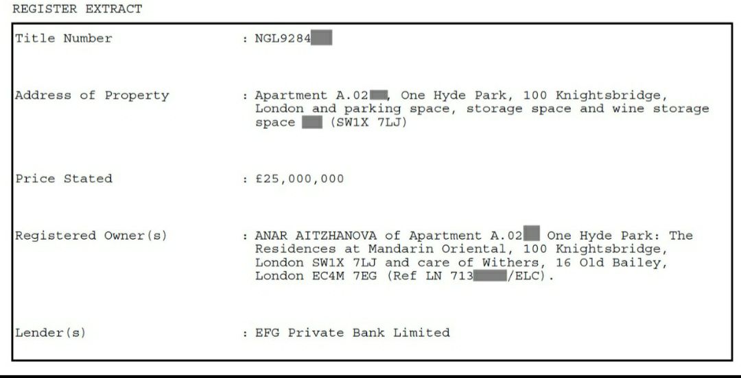 В 2016 году Анар Айтжанова заложила свою квартиру в британском филиале банка EFG — это международная группа банков с центральным офисом в швейцарском Цюрихе и специализирующаяся на работе с так называемыми high-net-worth individual (HNWI) — то есть клиентами, чьи свободные средства превышают $1 млн. Такие банки предоставляют услуги управления капиталом, активами и инвестициями и часто критикуются за помощь в уходе от налогов.