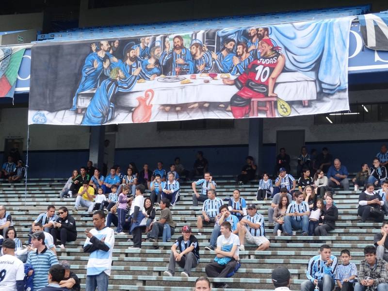 Жаль, в России больше не работают фан-секторы, а вместо легендарного Виража и вовсе сцена да барабаны. Некому будет заняться творчеством и подколоть Марио. В 2011 году мы показывали чемпионат Бразилии и я завороженно следил за переходом Роналдиньо во Фламенго. По сути была та же история: фаны Гремио мечтали о возвращении Рони к родным пенатам, а вышли страх и ненависть. Маленький Роналдо получил заслуженную обструкцию и величайшию версию Тайной Вечери Да Винчи: