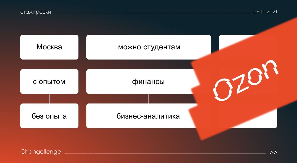 Ozon — один из крупнейших интернет-магазинов в России. В нем можно найти подарок для любимой бабушки, корм для котика, классную зимнюю куртку и не менее классную стажировку, если ты — студент из Москвы.