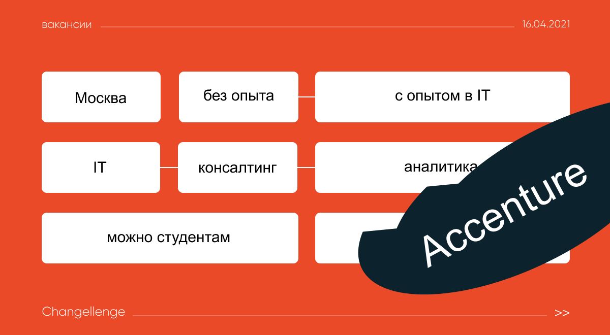 Много стартовых позиций в Accenture! Крупный игрок на IT-рынке, который входит в список 500 крупнейших компаний и 100 лучших работодателей мира. Accenture предоставляют клиентам решения в области внедрения, трансформации и стратегического развития цифровых сервисов.