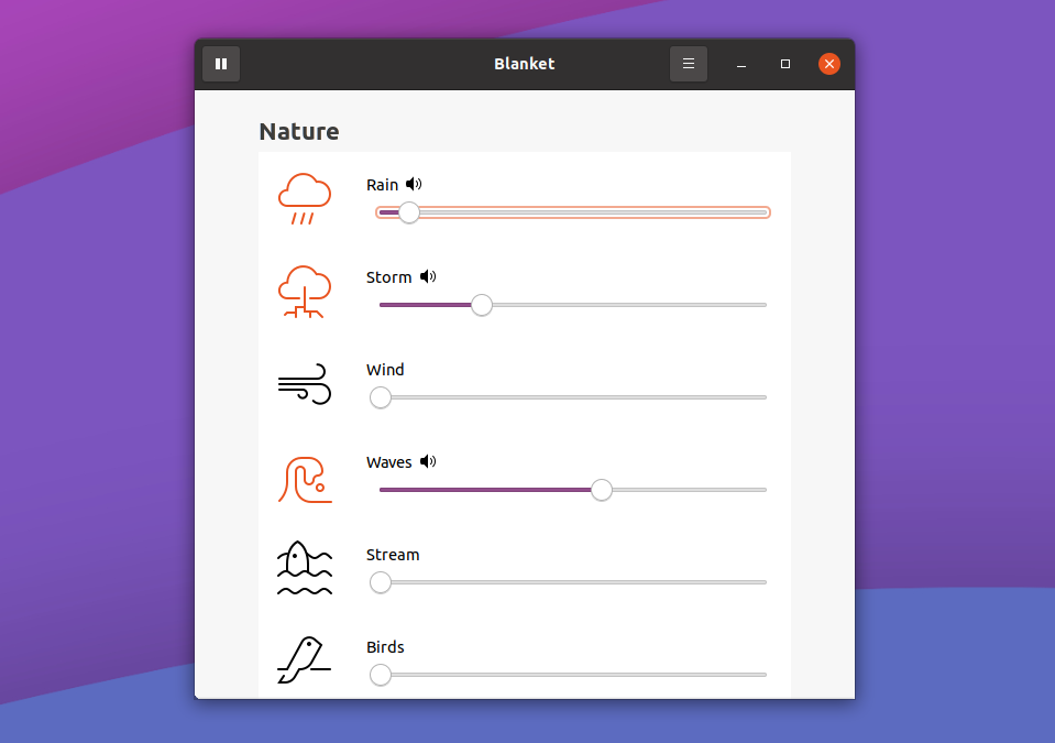 Это Desktop приложение для GNU/Linux, предназначенное исключительно для воспроизведения фоновых шумов, таких как звуки природы (например, дождя, грозы), нечеткий окружающий шум (например, шум кафе) и т. п.