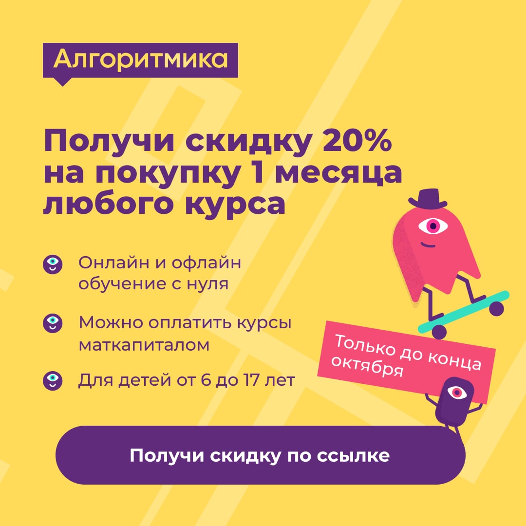 Оставь заявку на покупку курса на сайте международной школы «Алгоритмика». Получи скидку 20% на покупку 1 месяца любого курса до конца октября