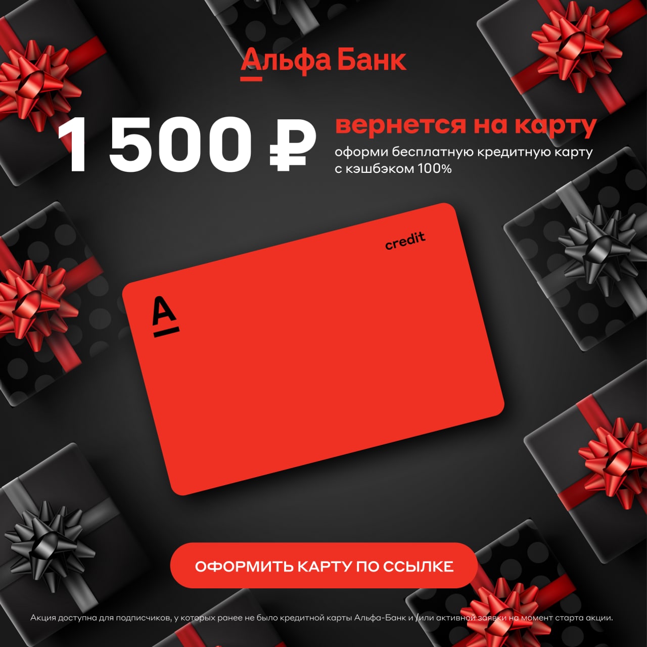 ❗️Акция доступна для подписчиков, у которых ранее не было кредитной карты Альфа-Банк и /или активной заявки на момент старта акции