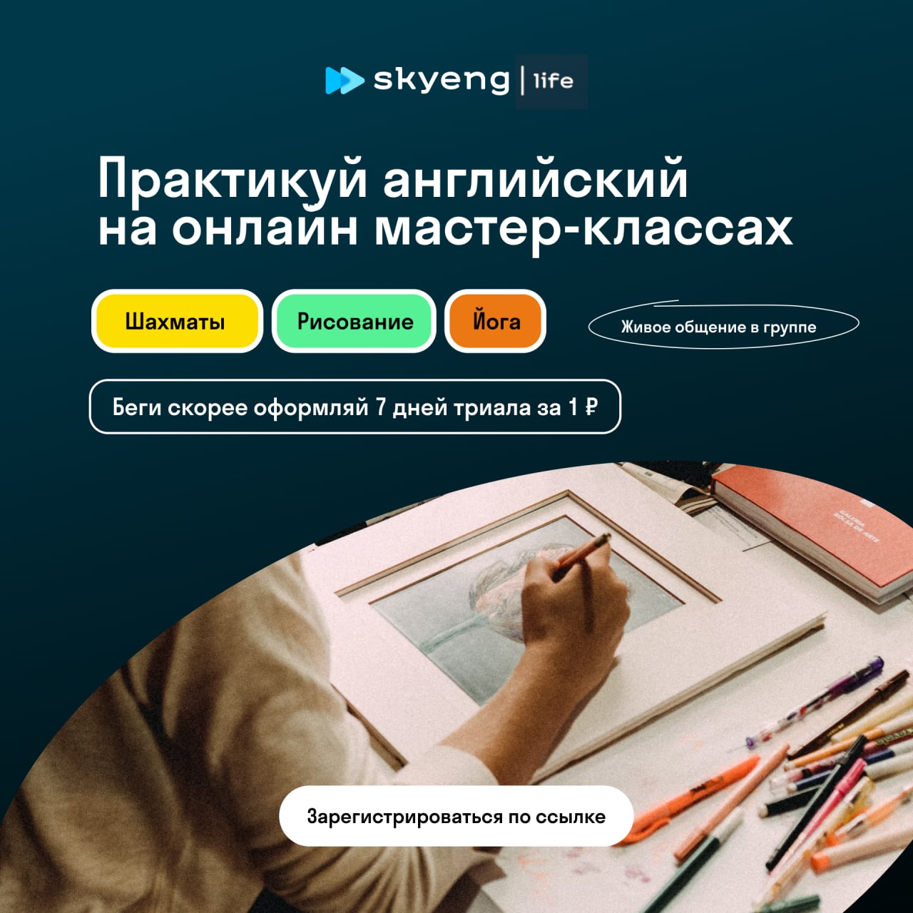 Зарегистрируйся в Skyeng Life и оформи 7 дней бесплатного доступа к онлайн мастер-классам на английском языке за 1 руб.