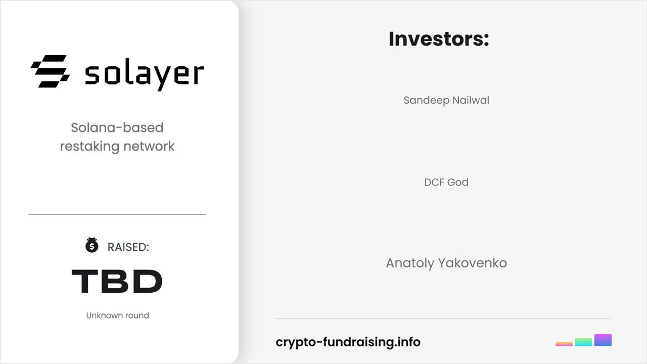 🔔 Solana-based restaking network Solayer closed funding round from Sandeep Nailwal, DCF God, Justin Bram, Anatoly Yakovenko, Nom, Joe Lallouz, Xinshu Dong, WSB Mod, 0xRooter, Joseph Delong. Amount raised is not disclosed.