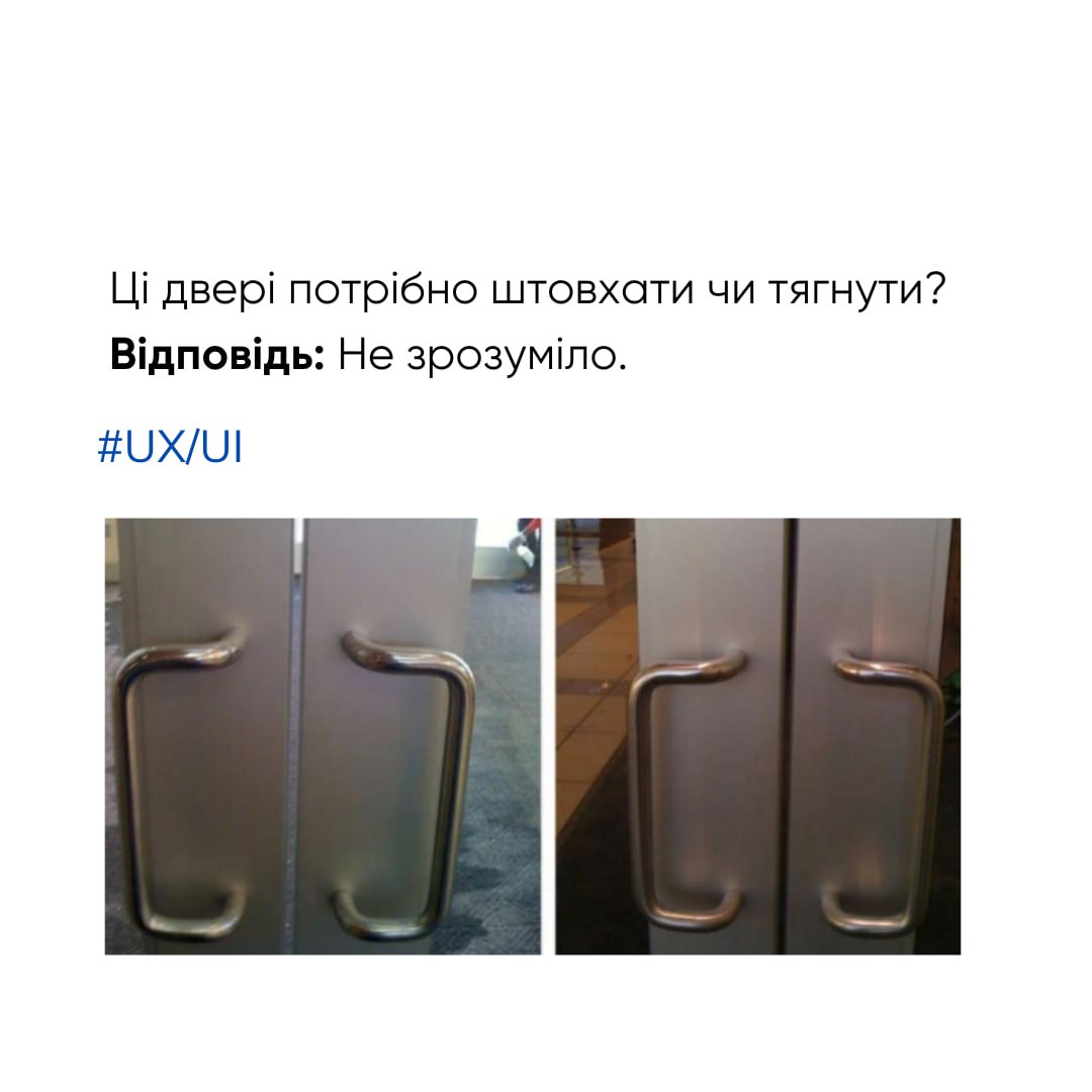 💡 А тепер уявіть, що такі двері — це інтерфейс продукту (сайту чи додатка). Користувачі плутаються, не розуміють, що робити далі, і в підсумку залишаються незадоволеними.
