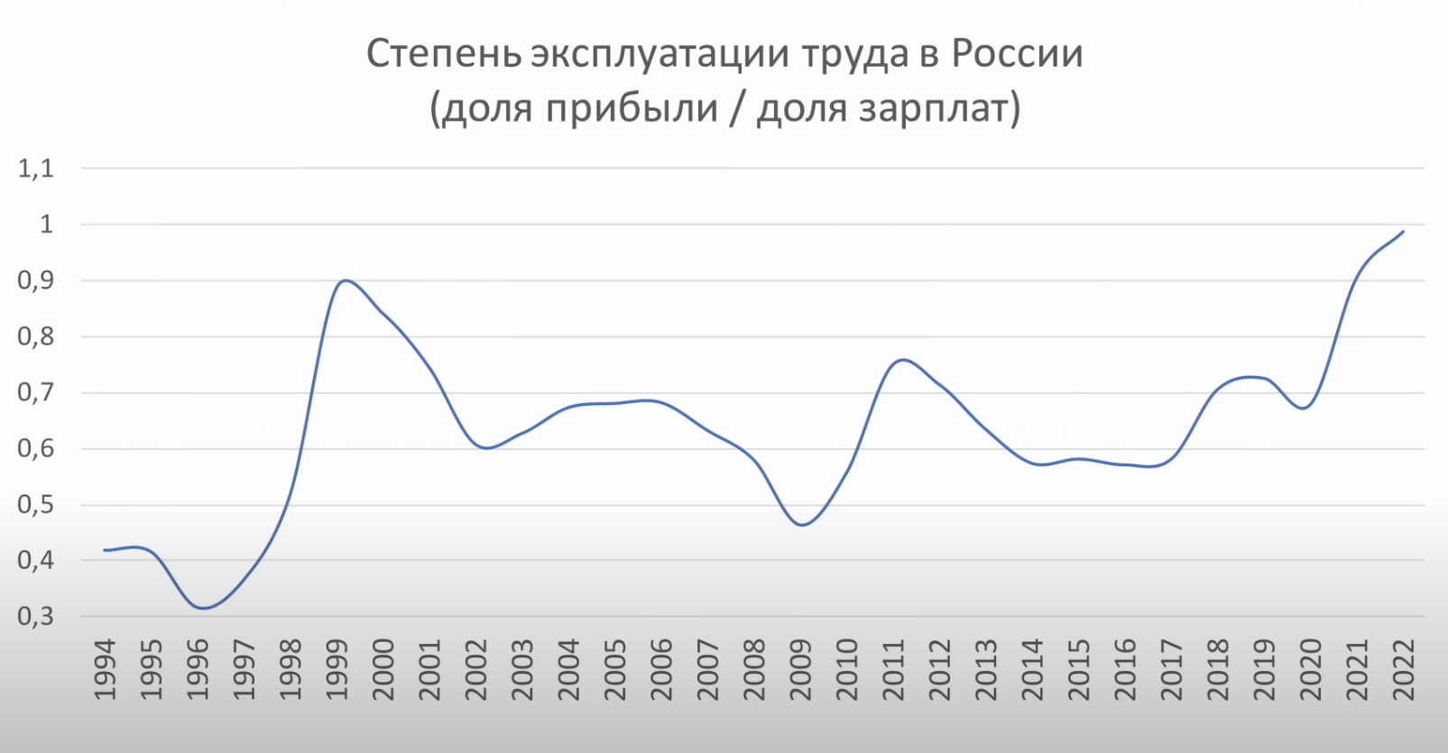 Российский капитал усилил эксплуатацию наёмных работников, которая в 2022 г. достигла исторического максимума. Об этом говорит отношение доли чистой прибыли к доле оплаты труда в национальном доходе, что росло с 0,4 в 1994 до 0,58 в 2017 и почти 1,0 в 2022 г. Такие данные привёл в очередном выпуске «Простых чисел» доцент Финансового университета и кандидат экономических наук Олег Комолов.