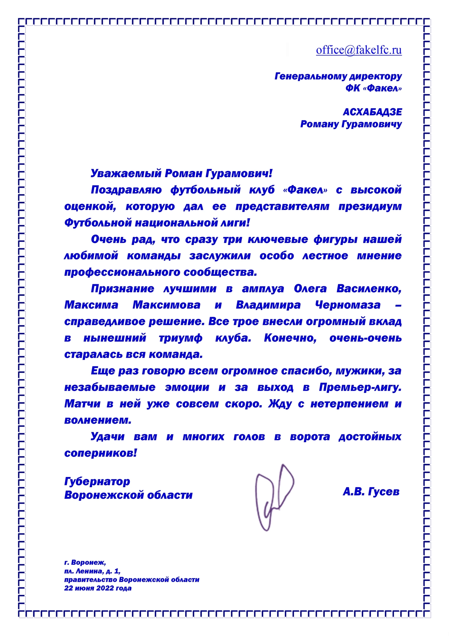 Губернатор Воронежской области Александр Викторович Гусев поздравил «Факел» с высокой оценкой, которую дал нашему клубу президиум ФНЛ. Наставник команды Олег Василенко признан лучшим тренером лиги, форвард Максим Максимов – лучшим нападающим, а заместитель генерального директора Владимир Черномаз стал лучшим сотрудником по безопасности 🤝🏻
