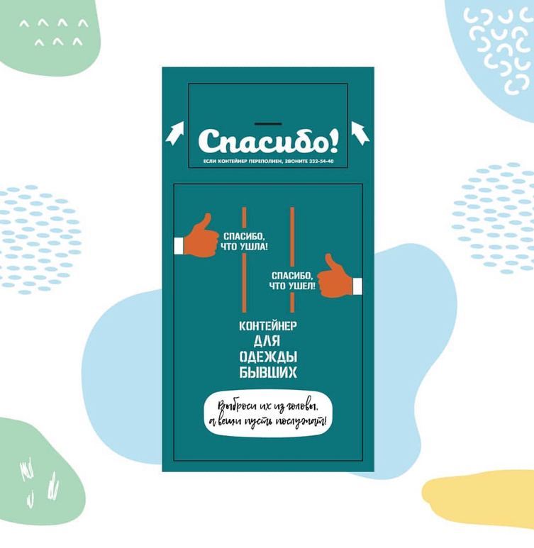 Специально для тех, кто на волне культа романтичности, вызванной Днем святого Валентина, вспомнил о своих бывших, появилась акция, которая поможет разорвать узы, связывающие с прошлым. В Санкт-Петербурге запустилась инициатива для тех, кто готов расстаться с напоминаниями о старых отношениях, а точнее — выбросить одежду бывших. Поп-ап проект «Зима в Никольских рядах» и благотворительный магазин «Спасибо!» создали для этого все условия. Сейчас в зимнем дворе «Никольских рядов» стоит специальный контейнер, в который можно отправить все ненужные вещи.
