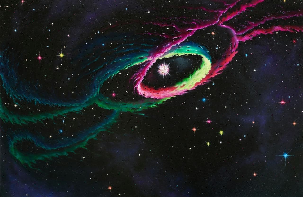 В экспозицию вошли восемь проектов одних из самых красивых объектов во Вселенной — планетарных туманностей, которые представляют собой облака, окутывающие умирающую звезду и мерцающие в ее свете. За основу художник взял реальную двойную звезду, вокруг которой скоро (по космическим меркам) будет образовываться планетарная туманность.