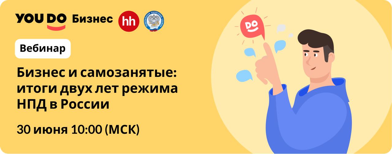 Чтобы помочь разобраться в подводных камнях режима НПД, 30 июня в 10:00 эксперты YouDo Бизнес проведут вебинар, на котором сооснователь YouDo и представитель ФНС расскажут об особенностях работы с самозанятыми, основных выгодах и рисках для бизнеса.