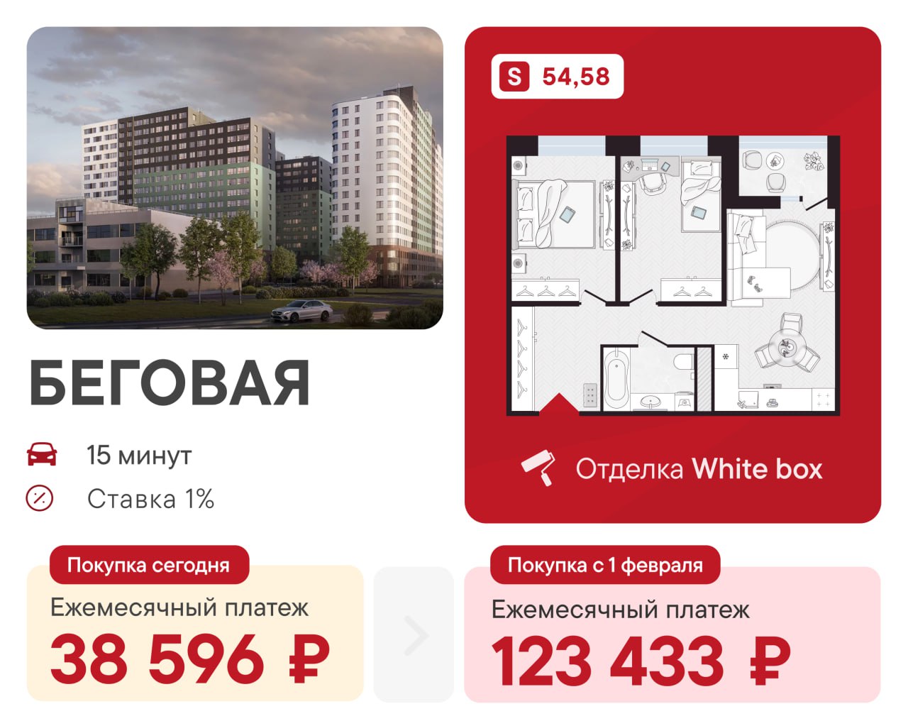 🔤 🔤 🔤 Ставка 1%: евротрешка с отделкой White Box в 15 минутах от «Беговой» за 38 596 ₽/мес