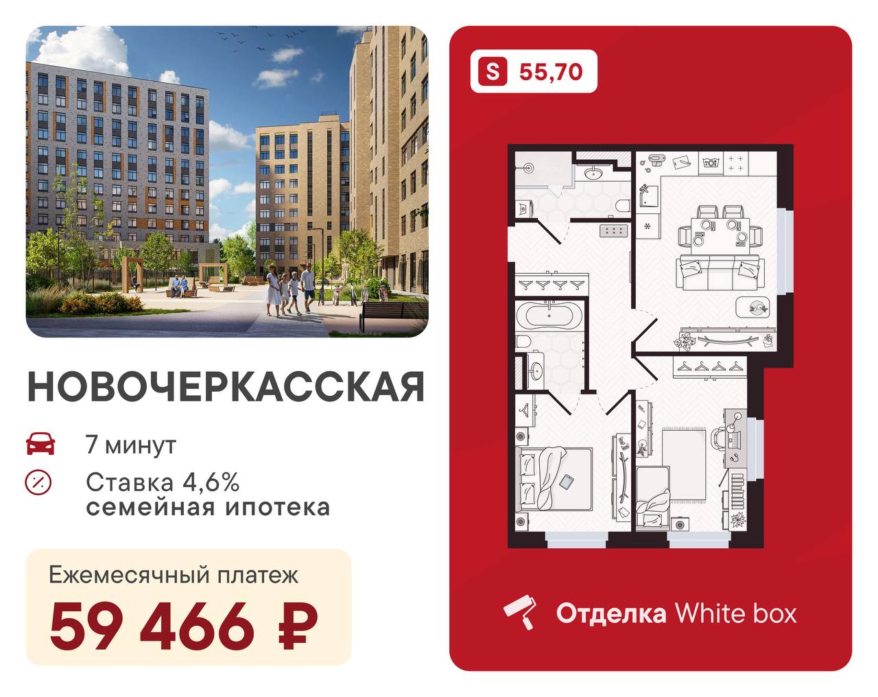 🔥 Евротрешка с отделкой White Box в 7 минутах от «Новочеркасской» за 59 466 ₽/мес