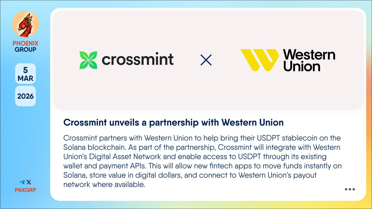 #Crossmint partners with #WesternUnion to help bring their USDPT stablecoin on the #Solana blockchain. As part of the partnership, Crossmint will integrate with Western Union’s Digital Asset Network and enable access to USDPT through its existing wallet and payment APIs. This will allow new fintech apps to move funds instantly on Solana, store value in digital dollars, and connect to Western Union’s payout network where available.