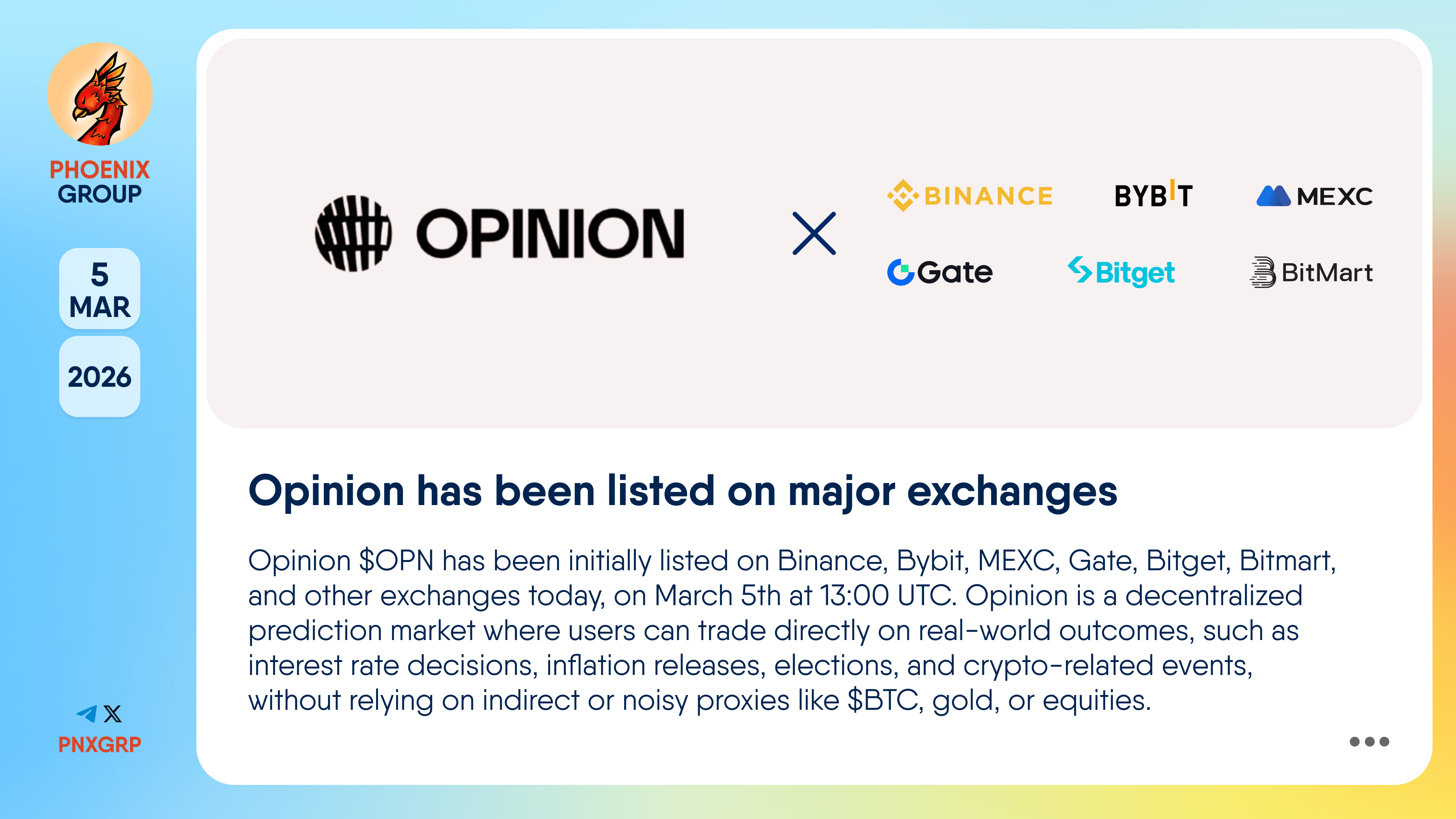 #Opinion $OPN has been initially listed on Binance, Bybit, MEXC, Gate, Bitget, Bitmart, and other exchanges today, on March 5th at 13:00 UTC.