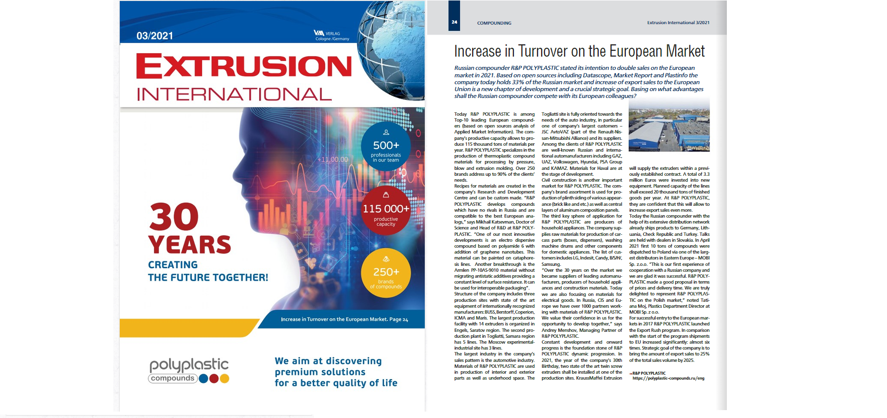 Extrusion International и его американская версия Extrusion International USA посвятили ведущему российскому компаундеру обложку третьего номера журнала и статью, в которой подробно разобрали причины, за счет чего НПП «ПОЛИПЛАСТИК» сможет увеличить свое присутствие в странах ЕС.