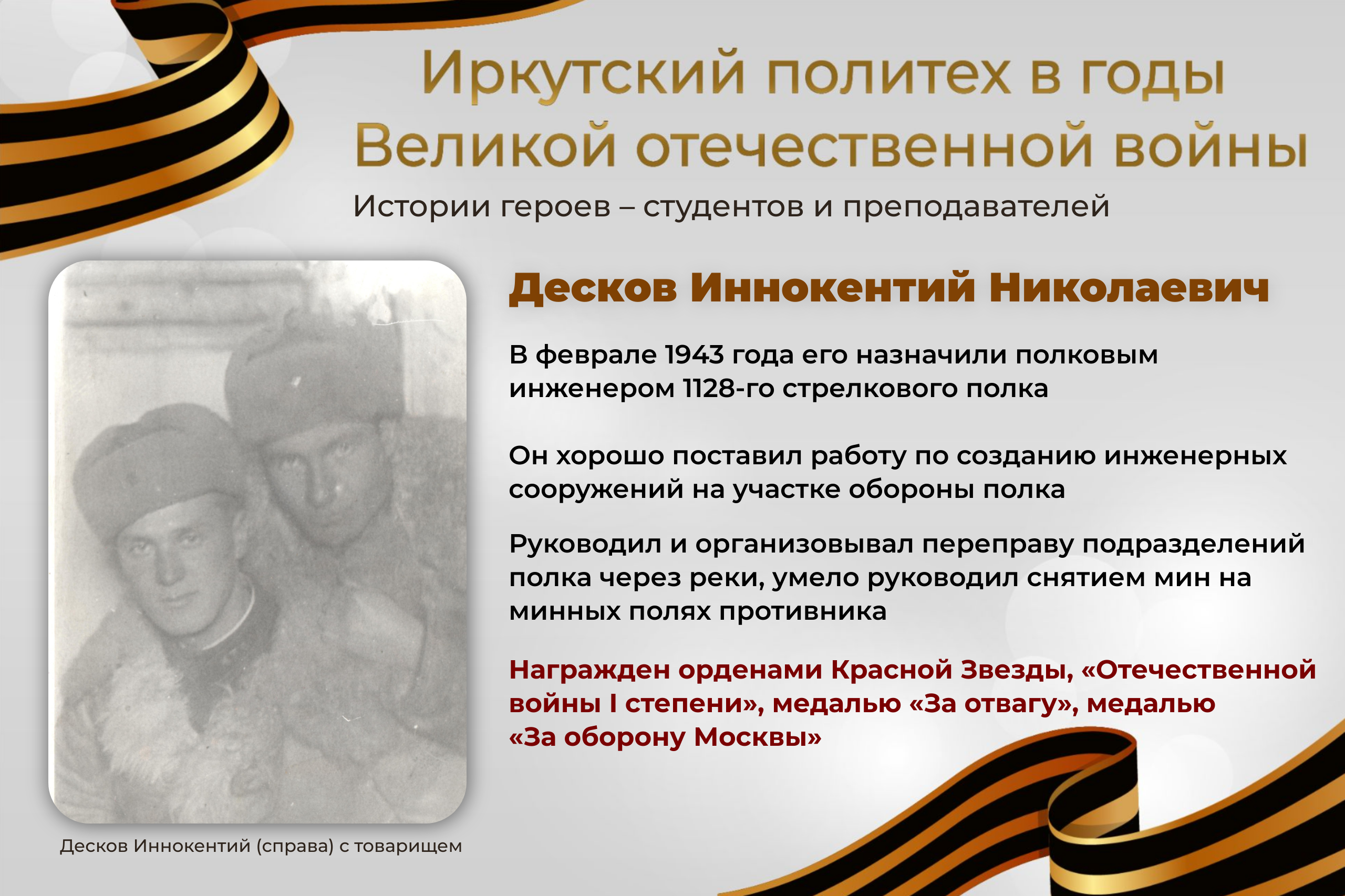 Знания, полученные в институте, помогли ему в кратчайший срок стать военным инженером. Всего четыре месяца Иннокентий Десков был командиром саперного взвода 291-го армейского инженерного батальона 20-й армии. Затем становится заместителем командира роты, командиром роты.