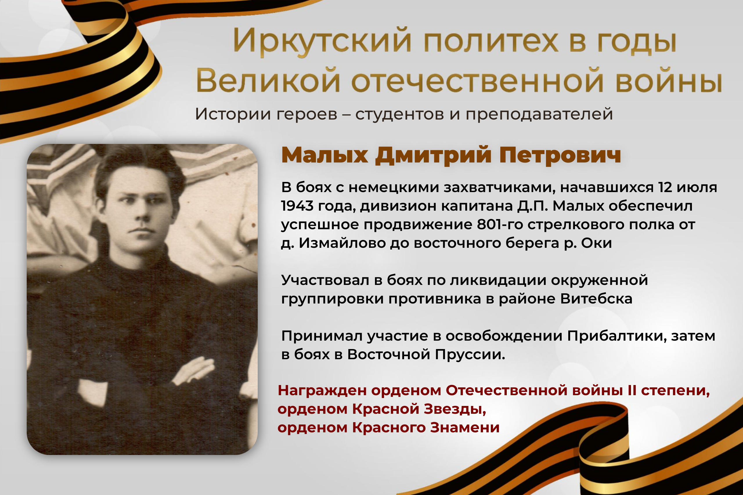 Сегодня рассказываем о Малых Дмитрие Петровиче в рамках цикла публикаций «Иркутский политех в годы Великой Отечественной войны».