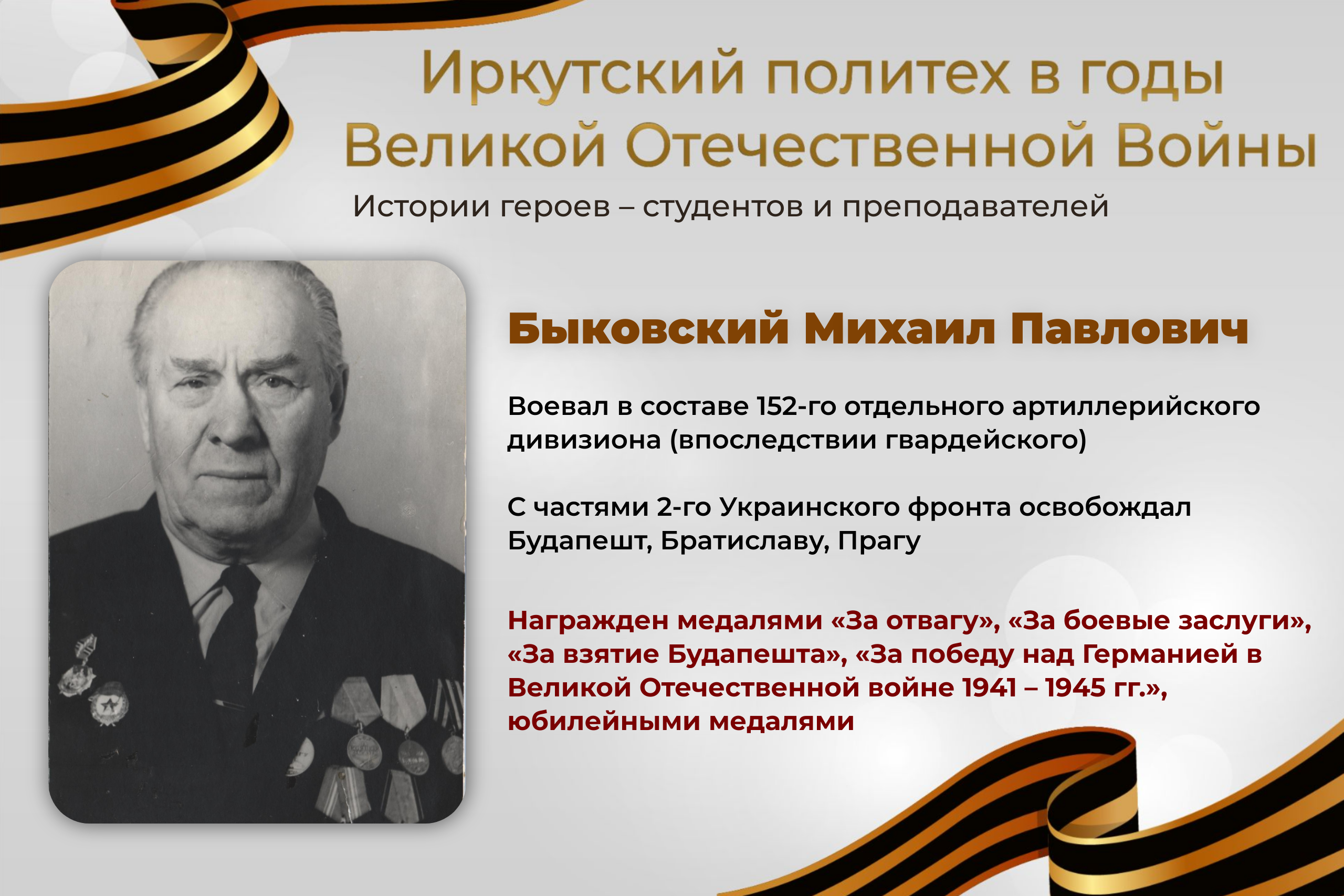 Родился 26 февраля 1900 г. в г. Иркутске. В годы Великой Отечественной войны М.П. Быковский воевал в составе 152-го отдельного артиллерийского дивизиона (впоследствии гвардейского). С частями 2-го Украинского фронта освобождал Будапешт, Братиславу, Прагу.