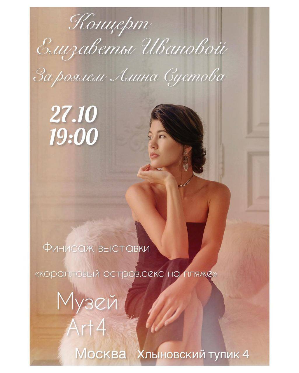 Последний день работы выставки “Коралловый остров: секс на пляже” в АРТ4 должен запомниться надолго благодаря концерту оперной певицы Елизаветы Ивановой в сопровождении пианистки Алины Суетовой - вас ждёт увлекательная программа камерной и оперной музыки, в которой прозвучит музыка русских, французских и итальянских композиторов.