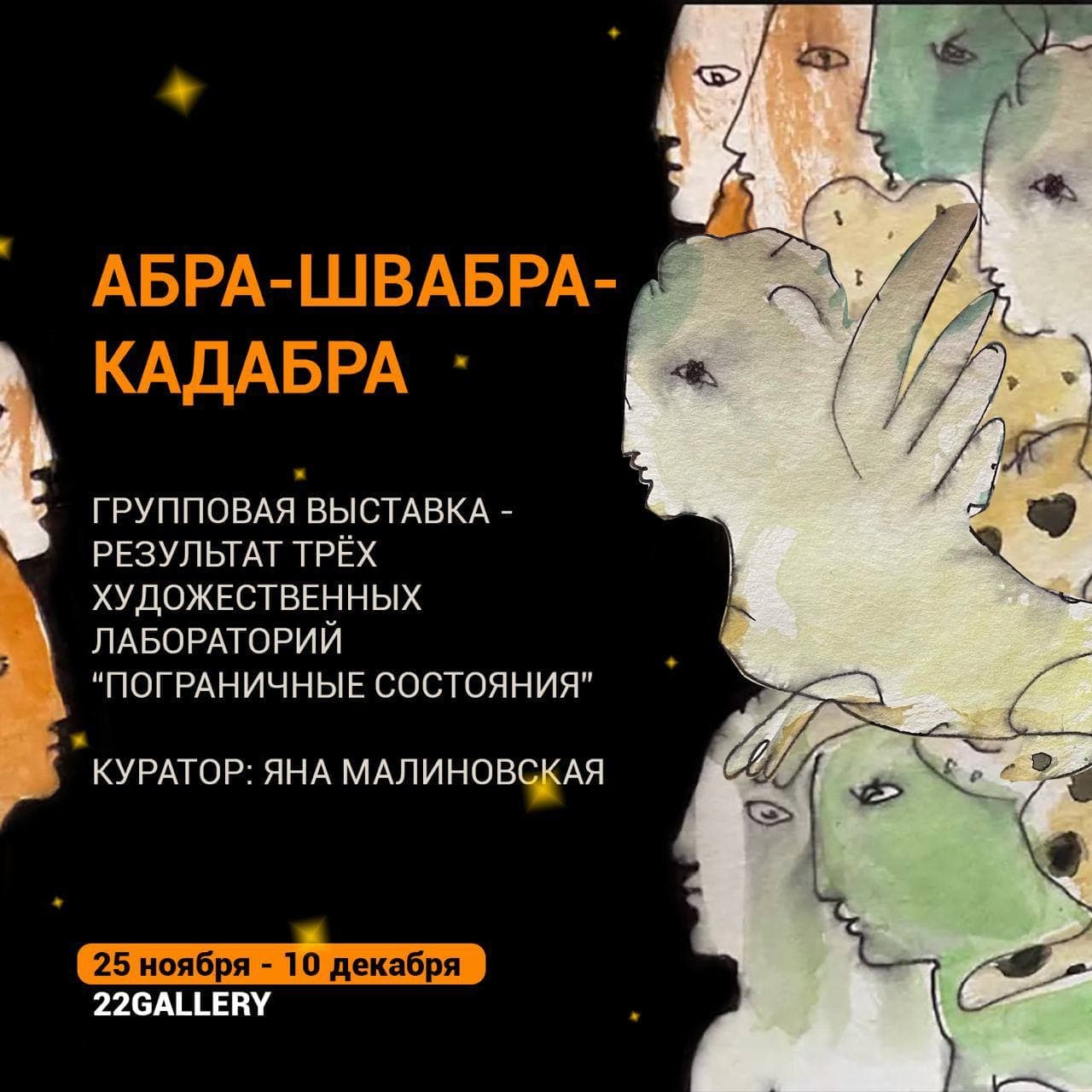 25 ноября, в четверг в 19-00 в Галерее 22 открывается групповая выставка «Абра-швабра-кадабра» по итогам трёх лабораторий «Пограничные состояния» (куратор Яна Малиновская). Участвуют художники из самоорганизации и приглашённые авторы.