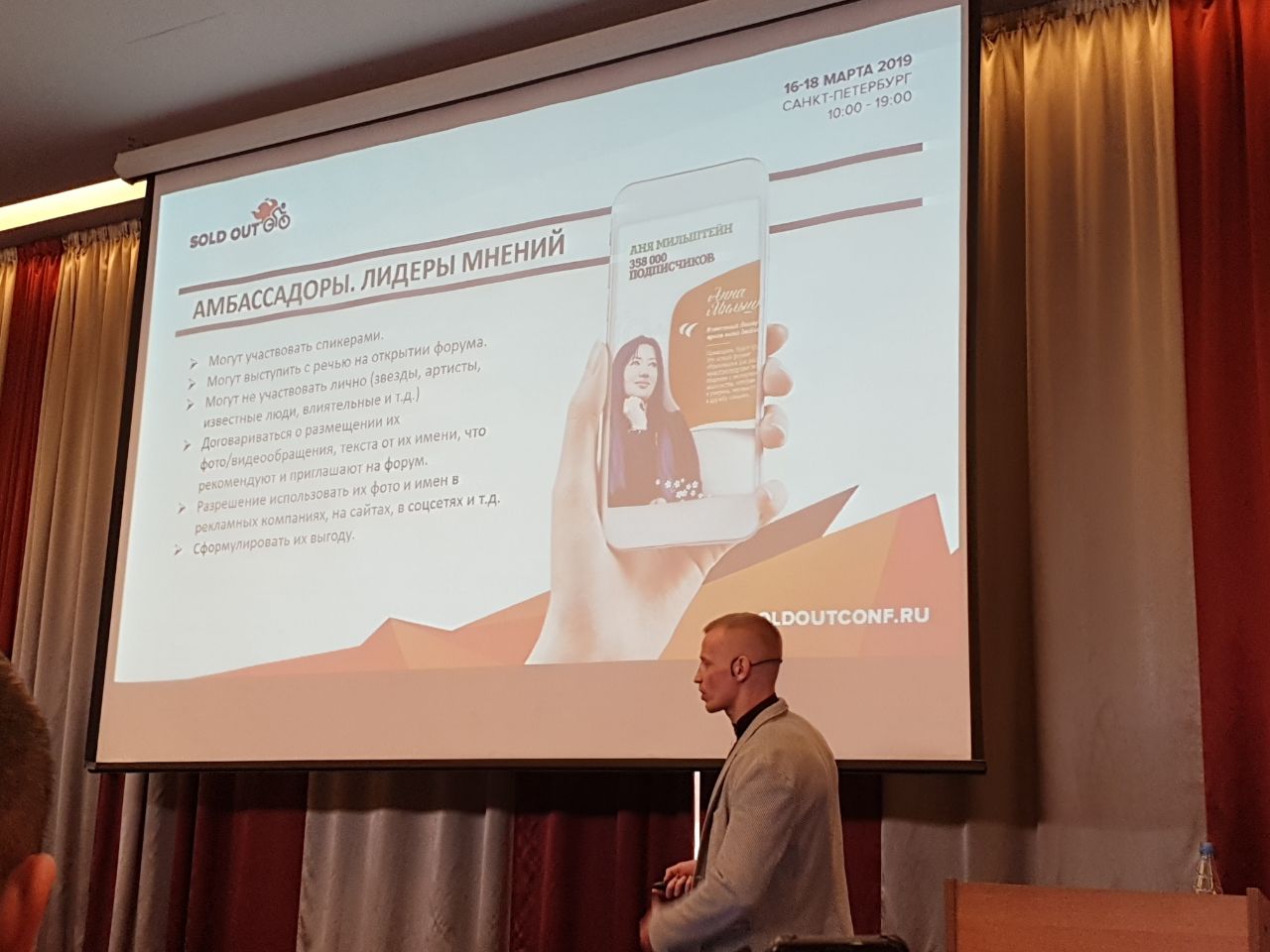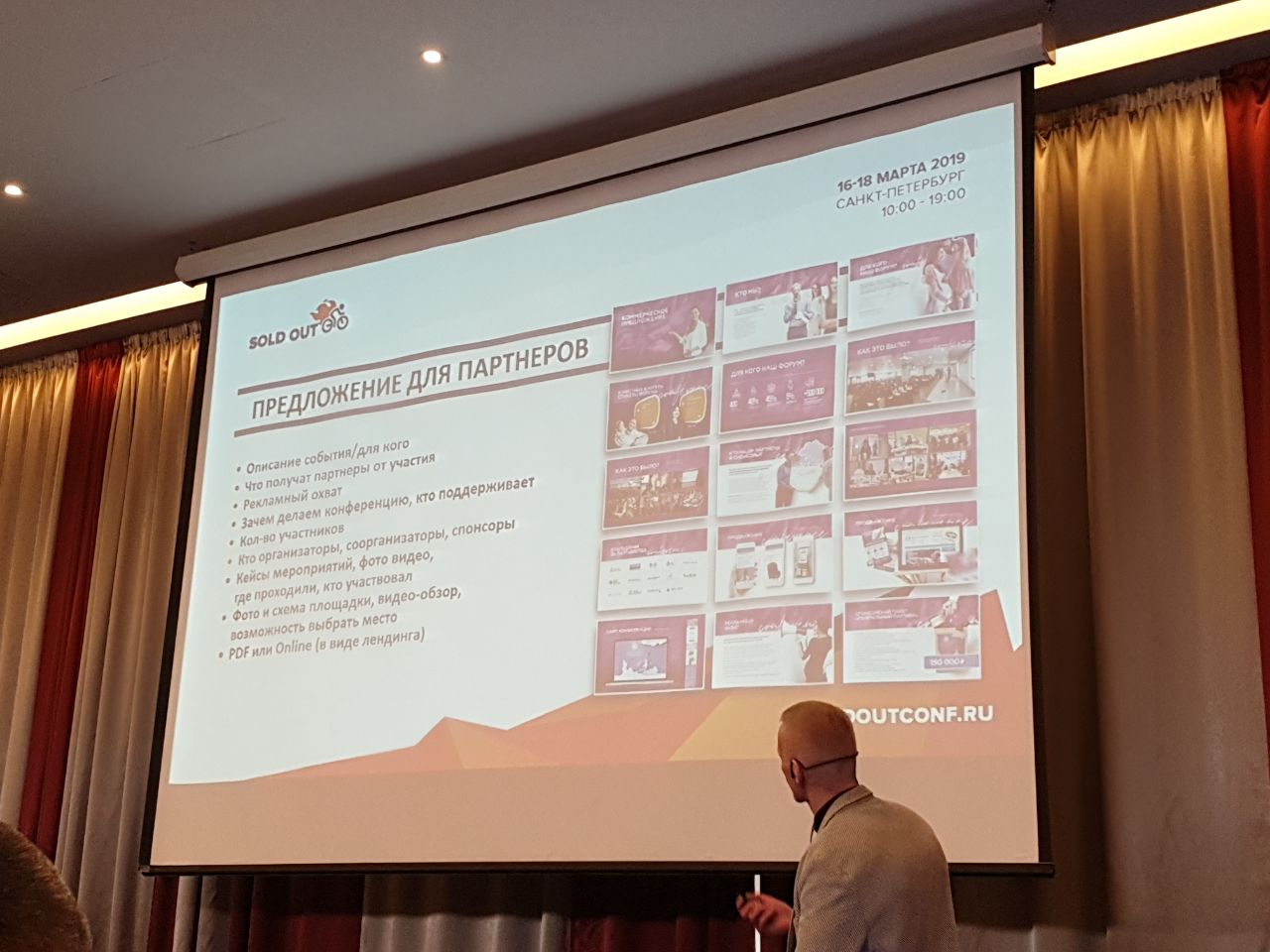 Завершился перерыв и началась пятая секция докладов. Я слушаю Андрея Сенаторова и его доклад "Как организовать конференцию без бюджета, заработать и масштабировать"