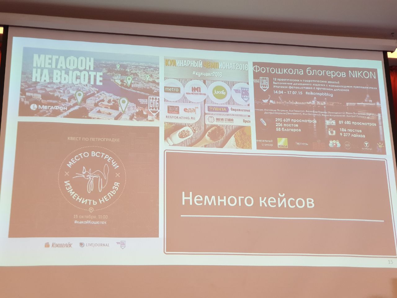 Началась первая секция докладов. Я слушаю лидера сообщества петербургских блогеров Павла Прокофьева с лекцией "Поиск и работа с партнерами. Синергия брендов и медиа в спейпроектах"