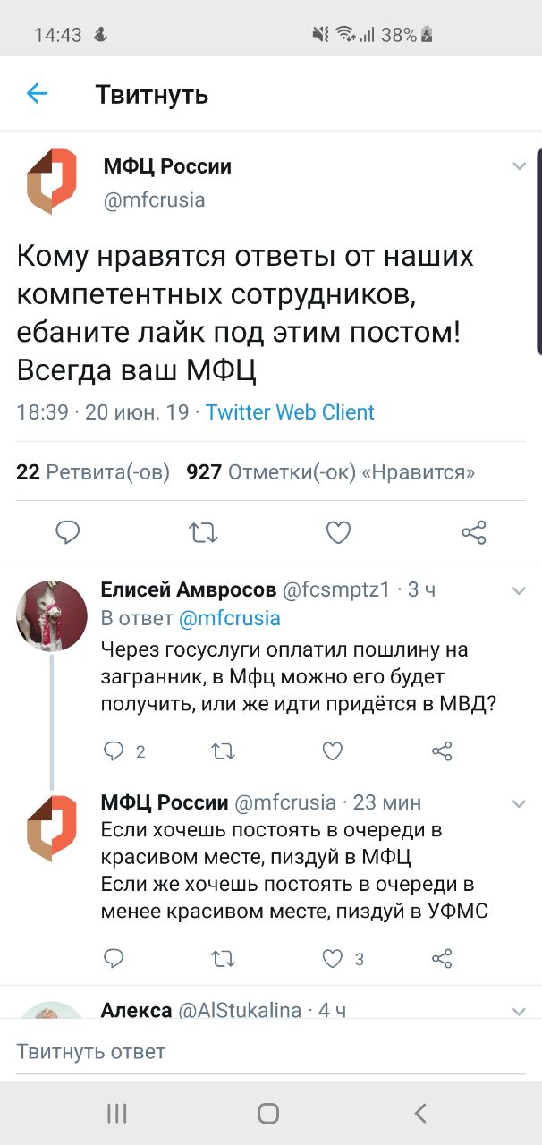 Запомните, если вы не будете работать со своими клиентами и их отзывами в соцсетях, это рано или поздно будет делать кто-то другой. Так, например, произошло с МФЦ 😁😁😁